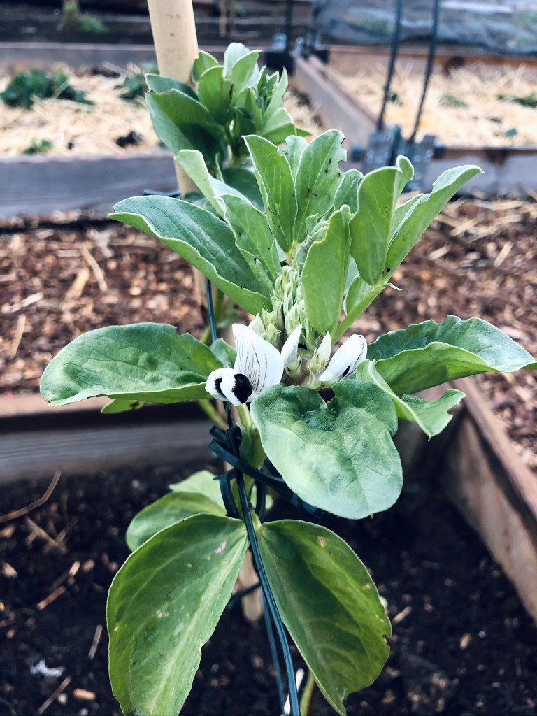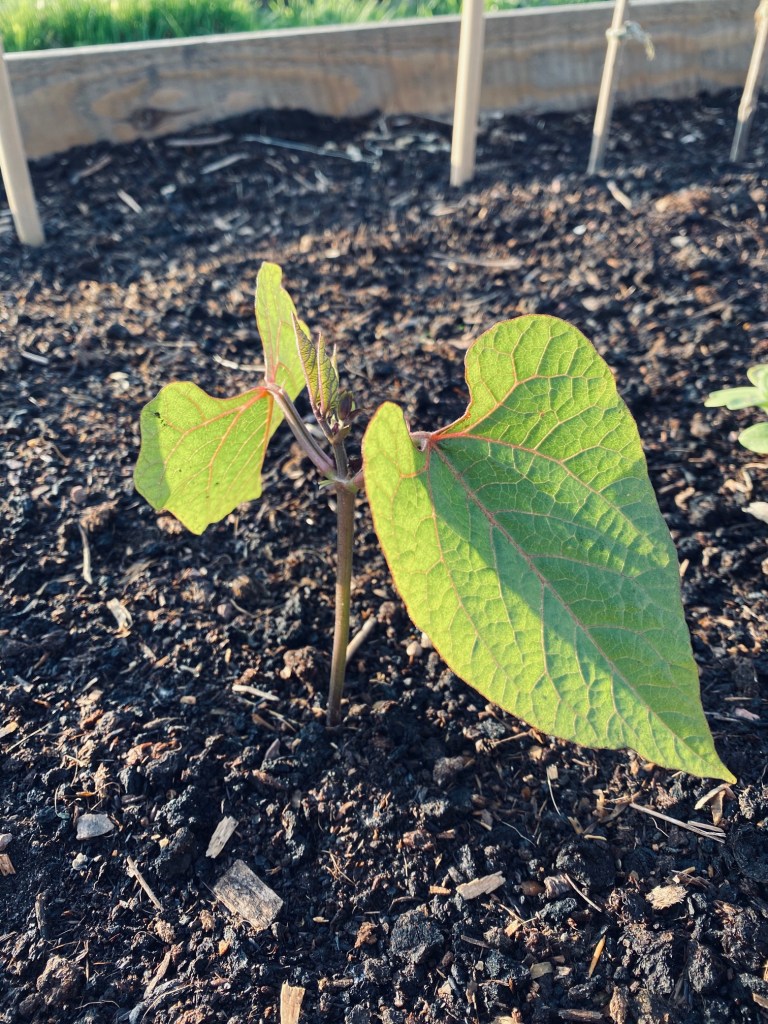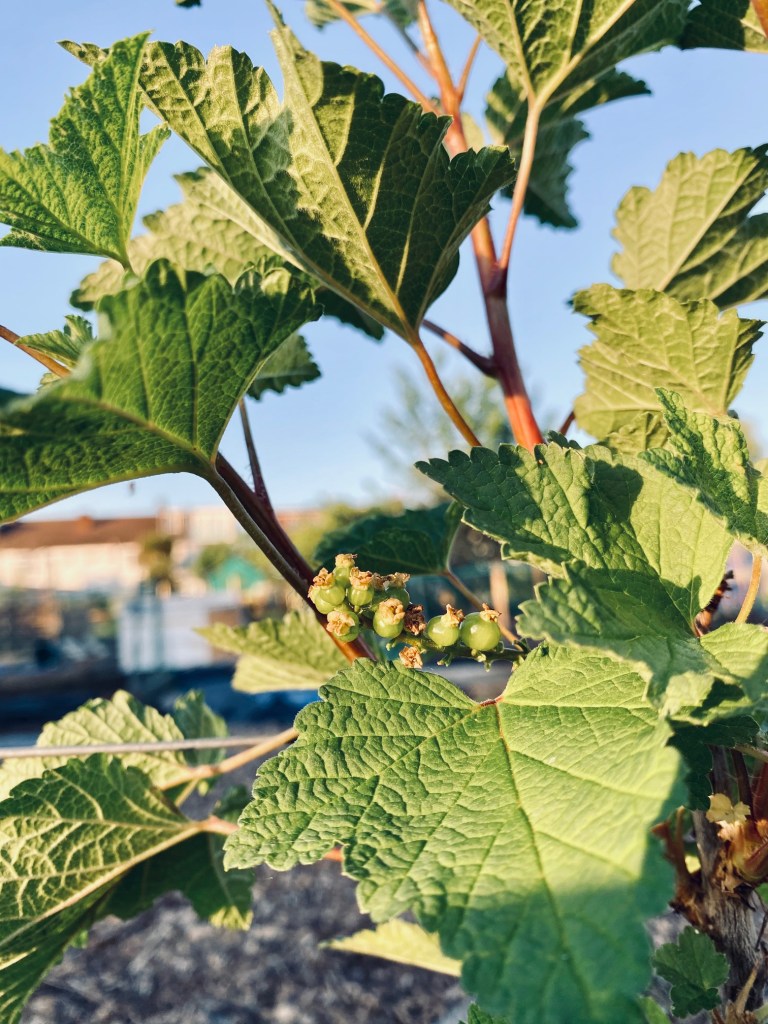 We’ve had onions, broad beans, and potatoes in the raised beds for a couple of months now and some new gooseberry and currant cordons, but we did have a very late and unexpected frost last week. We weren’t able to get protective fleece in such short notice, so we earthed over the potatoes as much as we could. Still, the cold dip didn’t do our potatoes much good, and we lost a couple of smaller plants, but actually most of the plants that were already outside have coped with it pretty well, there are still little fruits forming on our redcurrant, and the potatoes seem to be bouncing back.