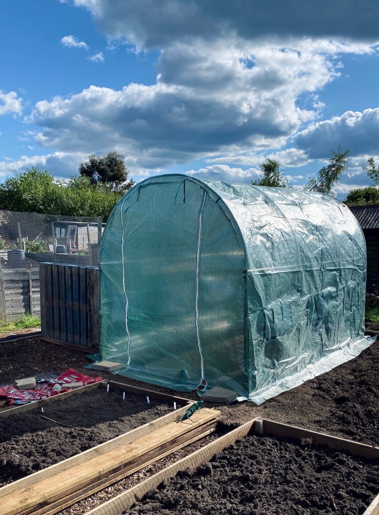 The last big building project that we’ve been really keen to finish is the polytunnel. In our early, ambitious plans we had hoped to get the tunnel up before the winter so that we could get some seedlings going early, but with the rain in both the autumn and late winter months we just weren’t able to get the ground cleared without potentially damaging the soil structure. With the dry weather we’ve had over the past weeks we’ve been able to clear the space of weeds, raise the level up to match the rest of the plot (more on why we’re raising our plot in my previous update post), and finally get the tunnel built and most importantly, get the bloomin’ thing out of the shed! It’s now housing the dahlias and all of our seedlings before they’re big enough to be hardened off and planted out. The polytunnel can get really hot, so we’ve been making sure that it’s open as much as possible during the current heatwave so our little plants don’t bake.