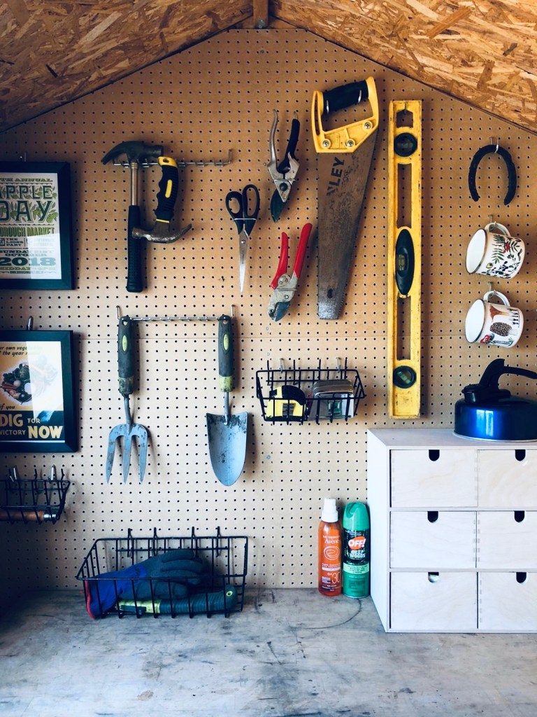 Since my last update, we’ve had a few big building jobs to do to get the plot properly up and running. The shed was already up, but it needed a paint job to make sure the wood was protected as much as possible (we had hoped to do that before the winter set in but the rain hampered progress whenever we had some time). It was great to have a spell of dry weather to get the painting done and the shed looks really smart now if you ask me. The inside of the shed also needed organising so that we could use the small space most efficiently. I set to work putting up some pegboard so that smaller tools can hang up above the table, and also built a rack on the opposite side for bigger tools. Now we can get in to the shed without either removing everything first or tripping over things!