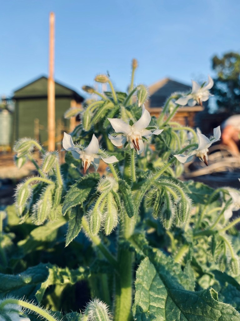 Before the garden centres closed we had been to get a few lovely daffidils, crocuses and primulas to add a bit of colour next to our pear tree, which is where we’ve got a little seating area. They’ve been an uplifting sight whenever we arrive at the plot and we’er hoping that they will naturalise well and come back for years to come. We’ve also been gradually adding to our herb garden with some interesting varieties that will be fun to cook with and that you can’t get in the shops. I’m especially excited about our lemon curd thyme and BBQ rosemary from Urban Herbs, and the “hot & spicy” oregano sounds pretty exciting too. Probably the herb we’ve used the most so far has to be the humongous borage plant that we got from The Culinary Herb Company. It has grown so quickly and prolifically that we’ve been harvesting leaves most days which have gone in to everything from tuna sandwiches to cold tea infusions and even a yummy cream sauce to go with fish. The flowers appeared recently and, rather than the usual blue, they’ve turned out to be white which was a pleasant surprise – the white variety is quite unusual.