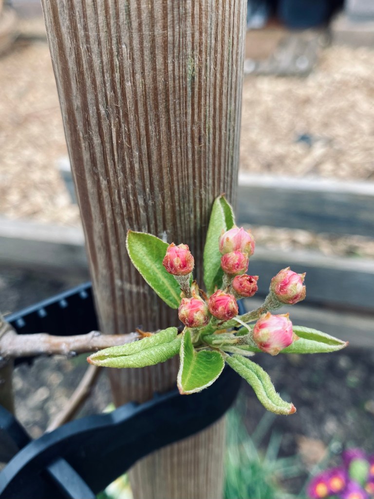 Now that the plot isn’t flooded we’ve been able to get on with clearing the last patch of land to raise and build beds on. The moisture level of the soil has meant that Mark has been able to make great progress as it hasn’t been so wet that it’s claggy and heavy, but not so dry that it feels almost like rock. We’ve got wood ready to build that last of the beds and I can’t wait to celebrate when the last of the plot is done! Maybe I’ll be posing with a glass of bubbles in the next update, but for now I’ll leave you with the emerging blossom from our tiny pear tree.