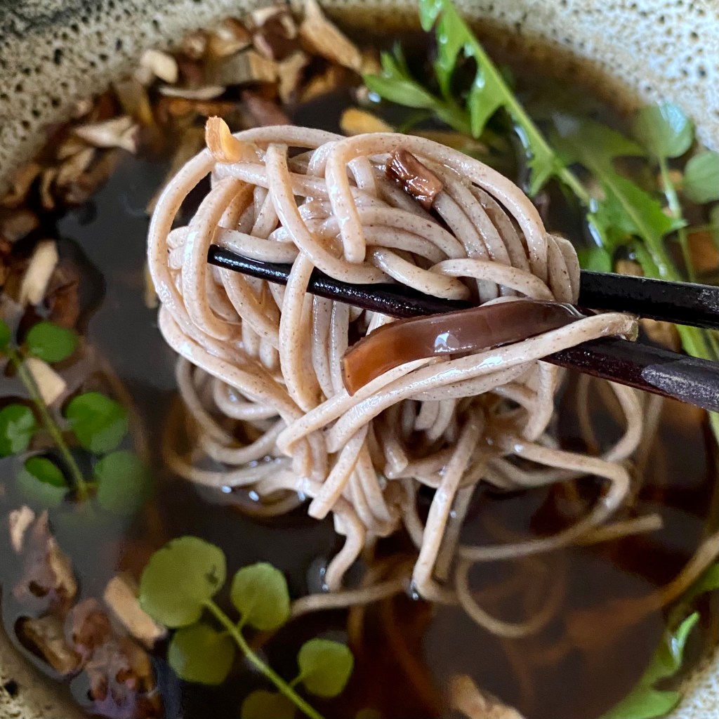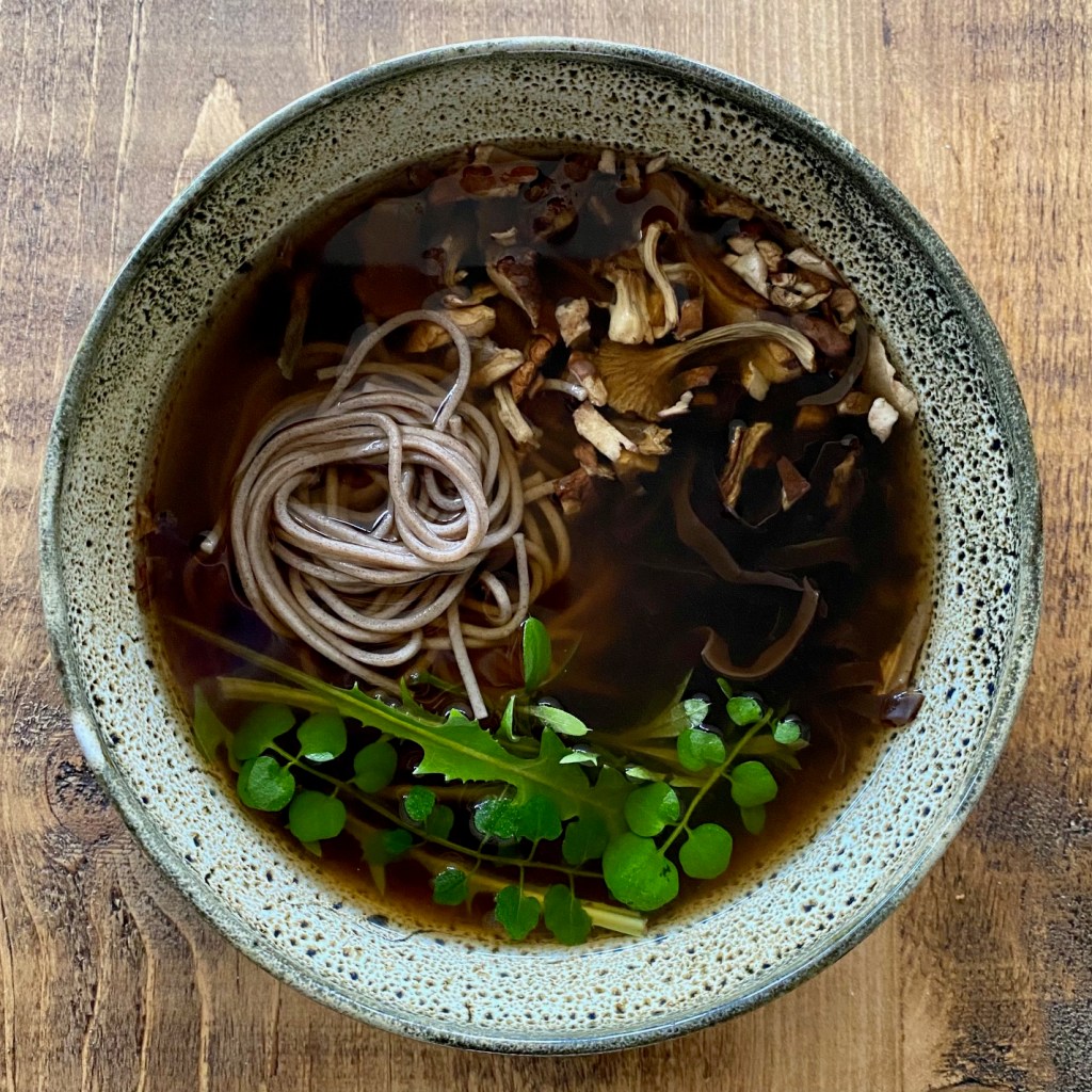 - Serve the soba noodles into bowls and ladle over your mushroom broth and wild winter greens. Top with the chopped rehydrated and the sautéed mushrooms and enjoy.