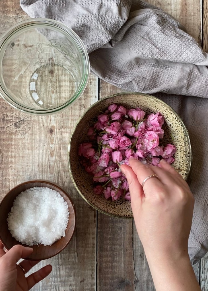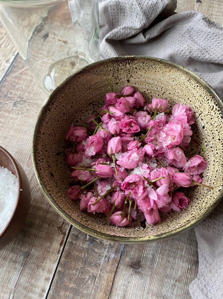 Layer your cherry blossom buds with sea salt in a jar so that they have a decent covering. Seal your jar and leave in the fridge for 3 days for the salt to draw out the moisture from the buds.
